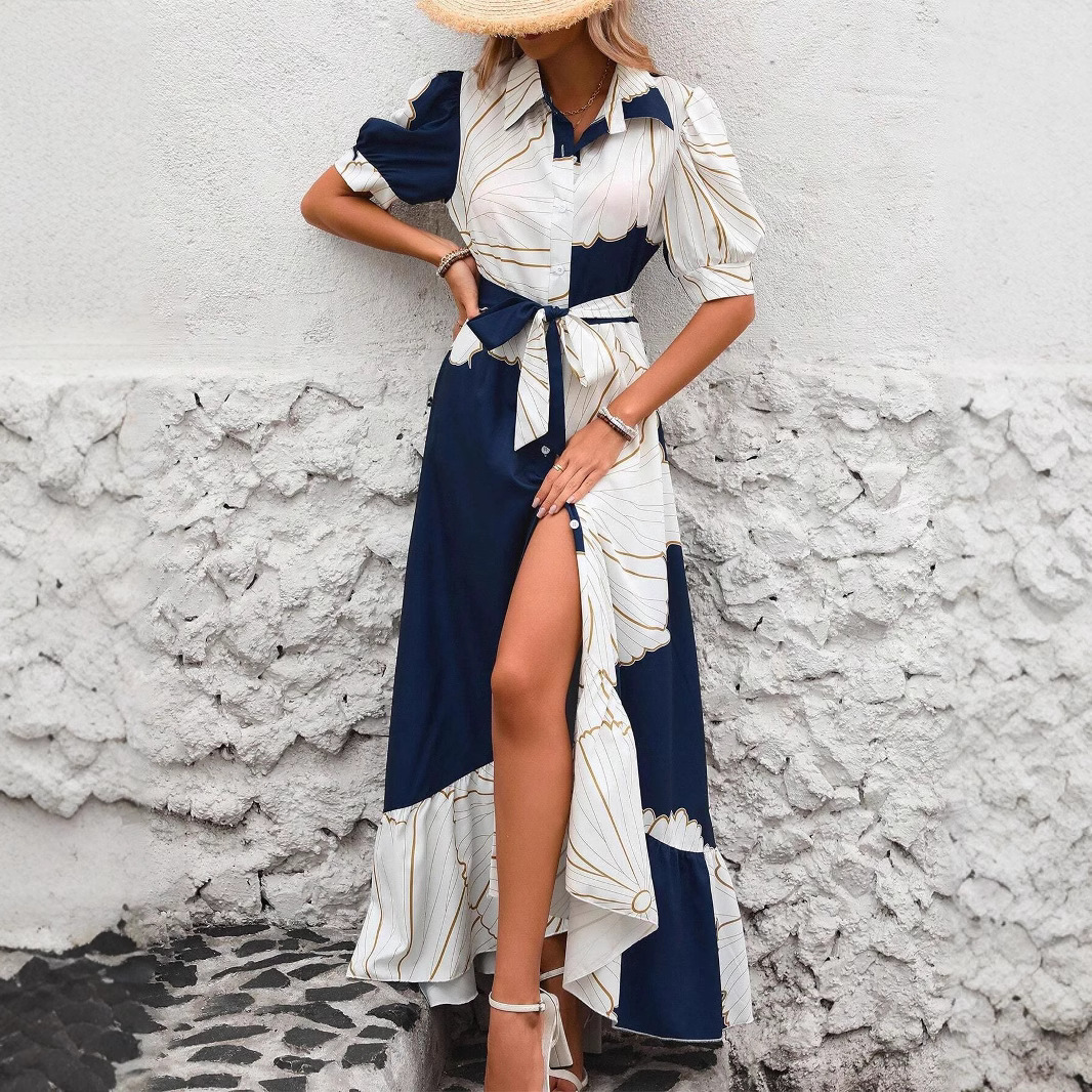 Women's Casual Printed Dress With A Turn-down Collar And Cinched Waist