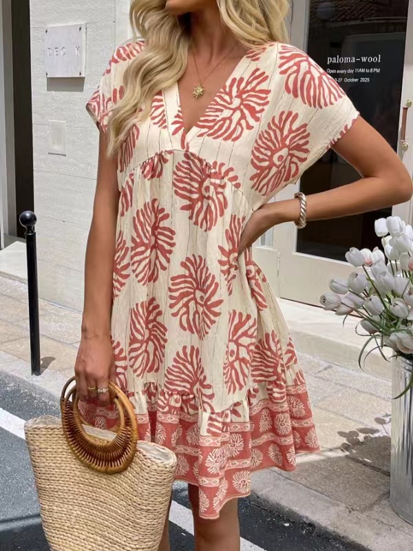 Women's Loose Casual V-Neck Digital-Print Short-Sleeve Dress