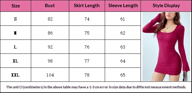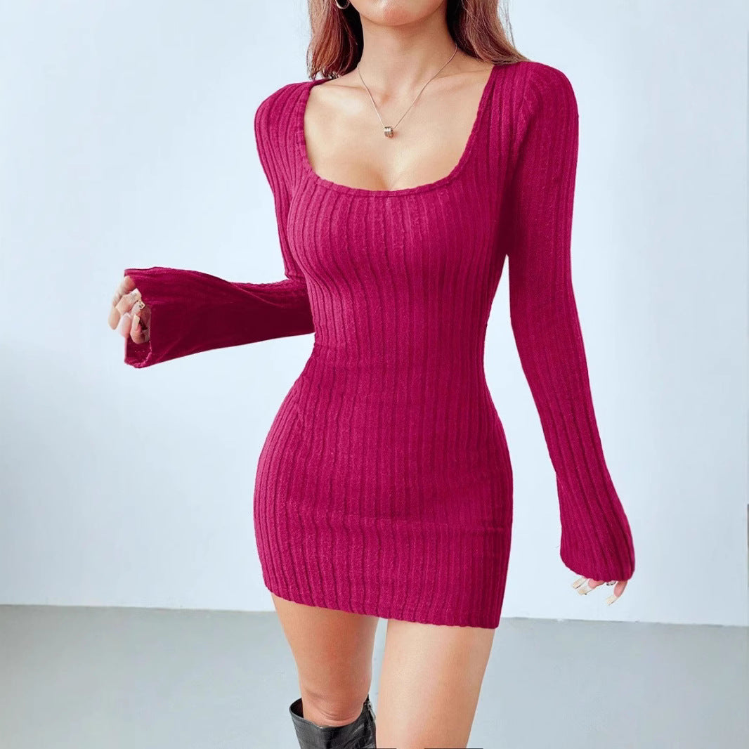 Women's Square-neck Ribbed Long-sleeve Slim-fit Solid-color Dress
