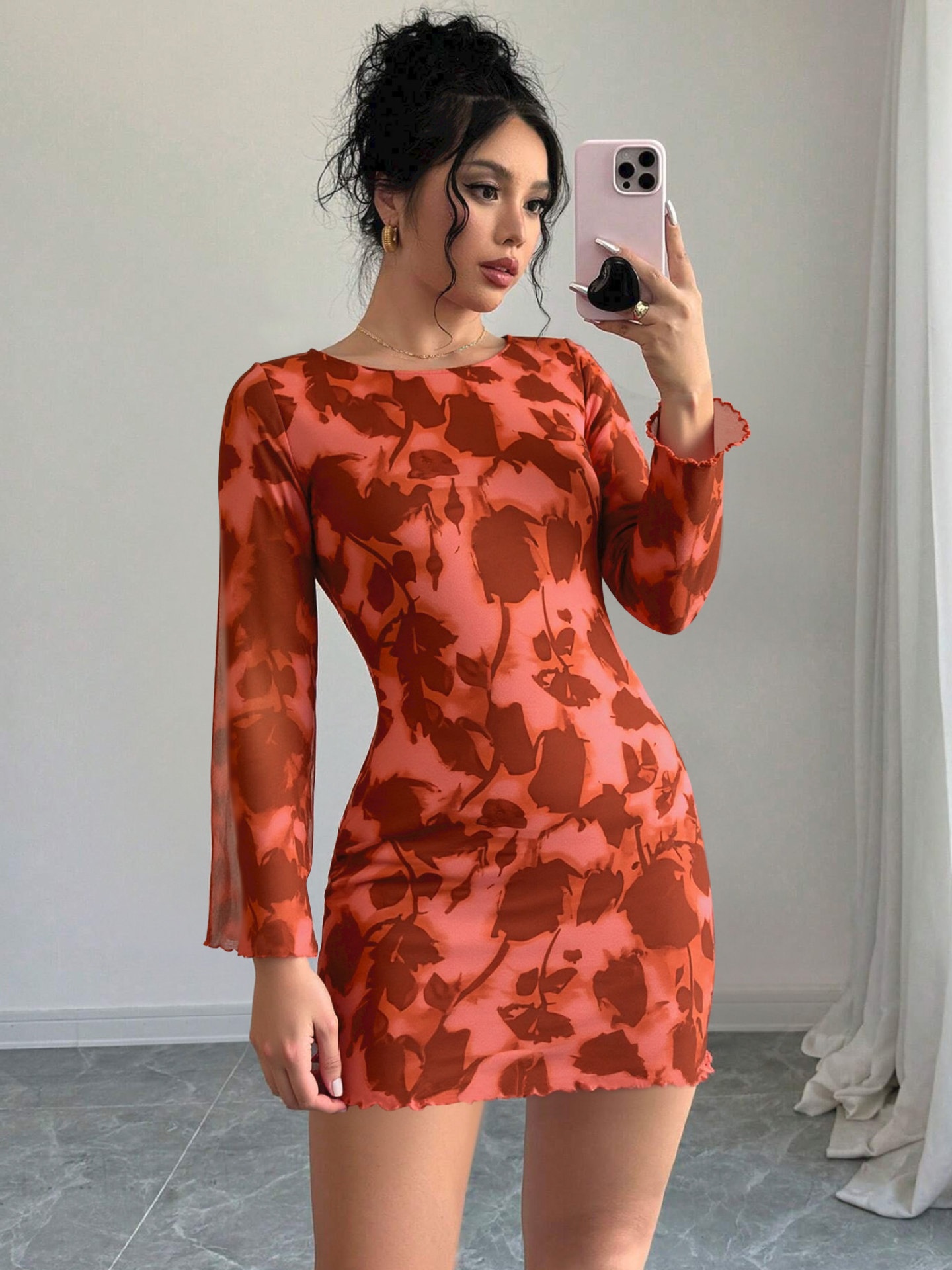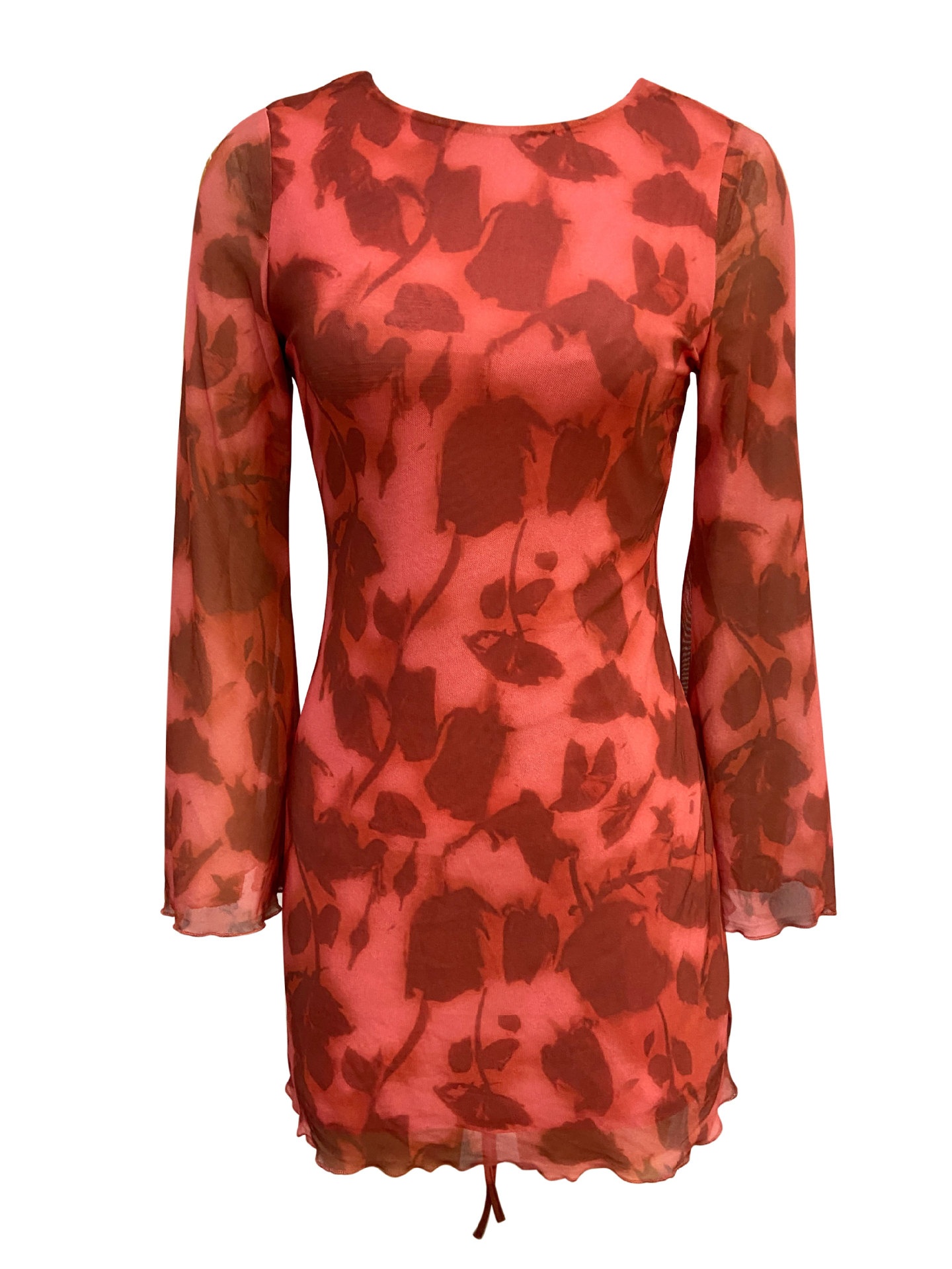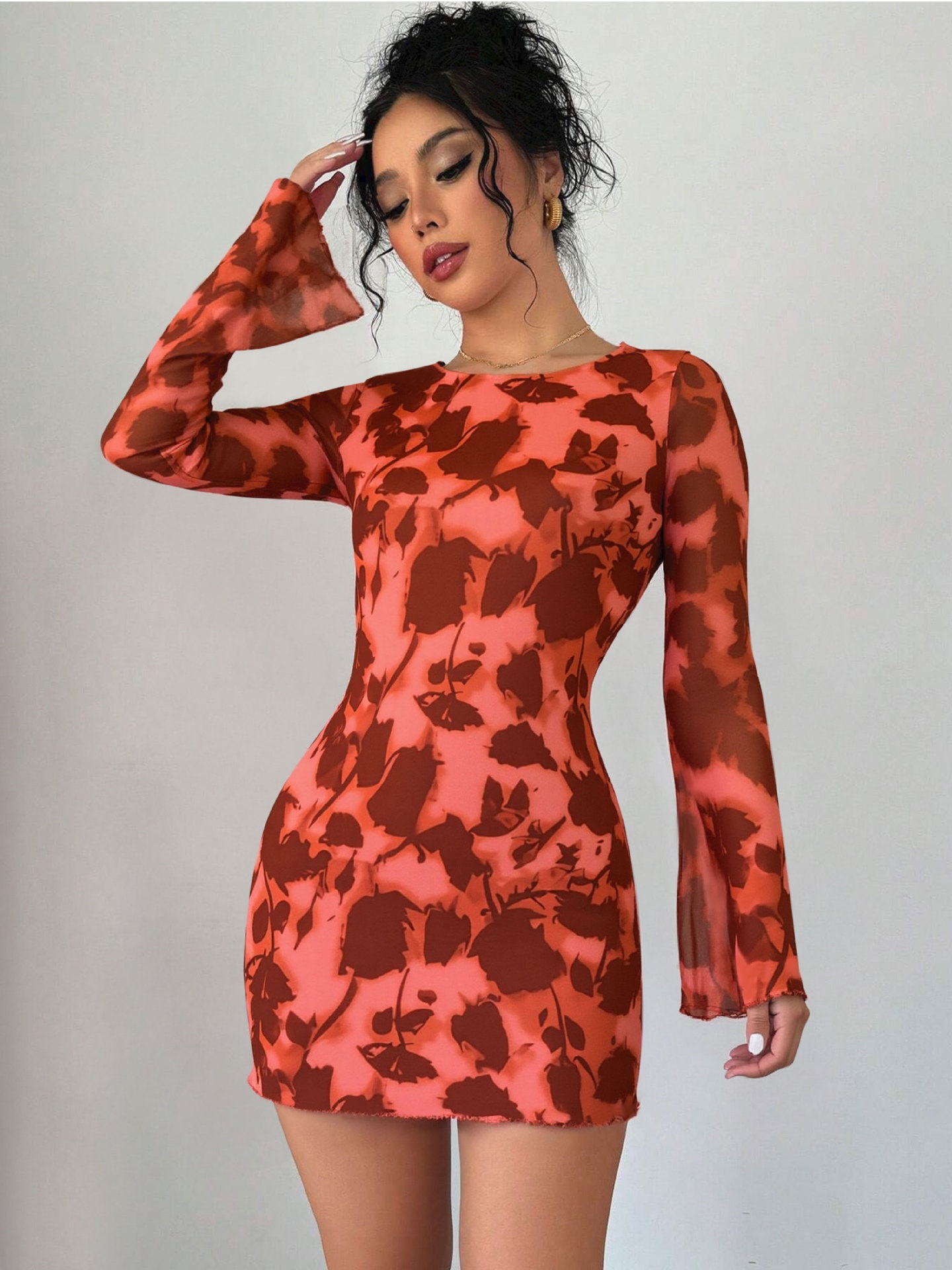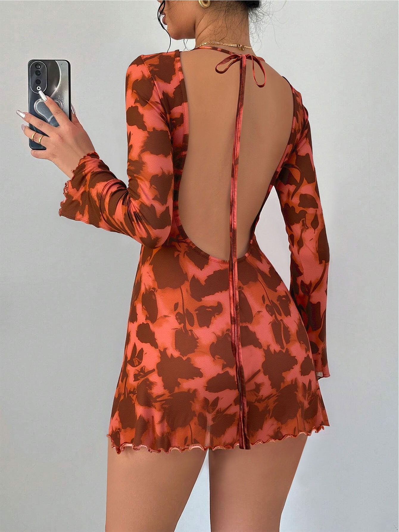Autumn And Winter New Sexy Backless Mesh Print Long Sleeve Bodycon Dress