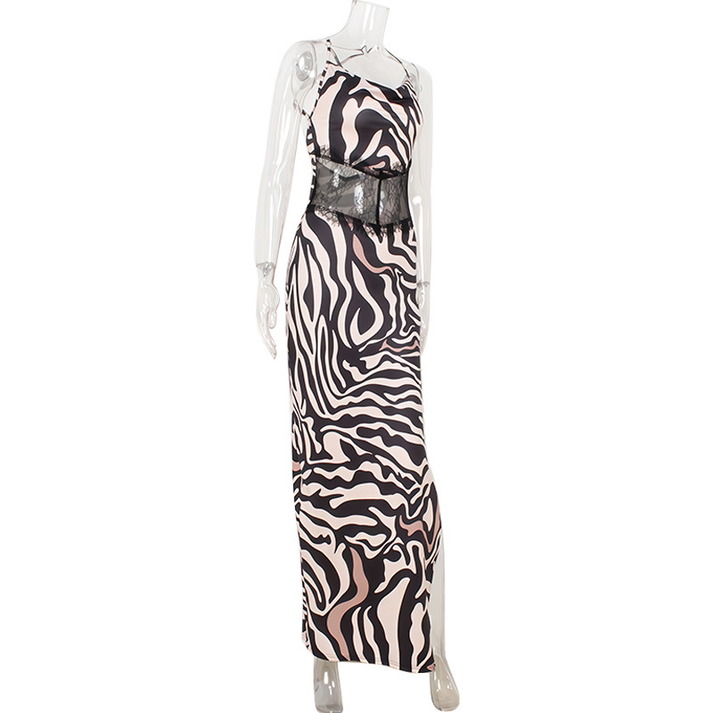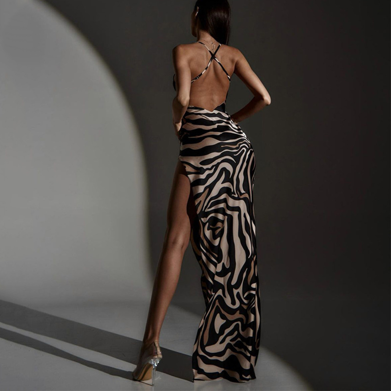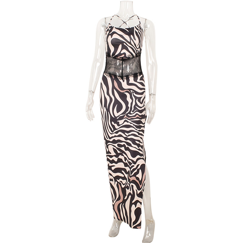 Fashionable Printed Patchwork Backless Slip Dress With Slit