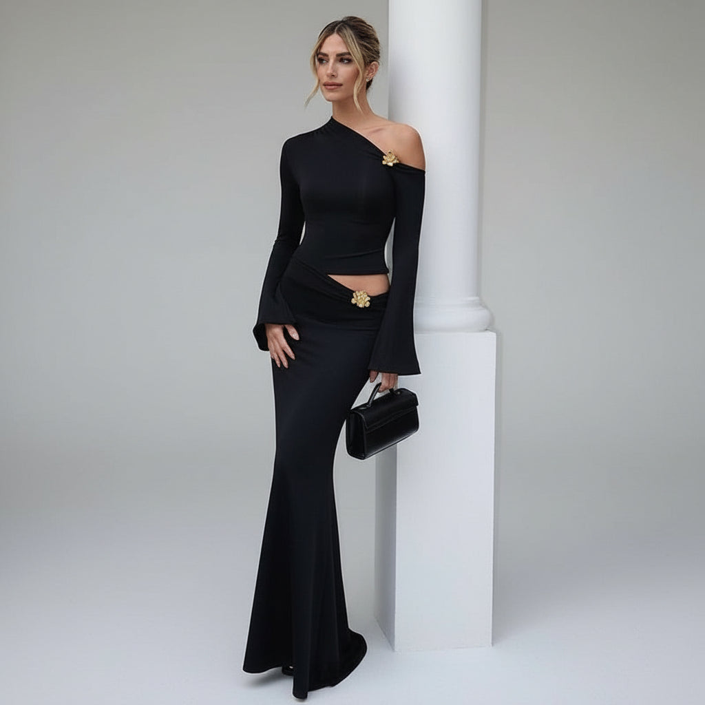 Sexy Slim Oblique Shoulder Skirt Suit With Flower Fashion Bell Sleeve Long Sleeve Top And High Waist Long Skirt Women Clothing