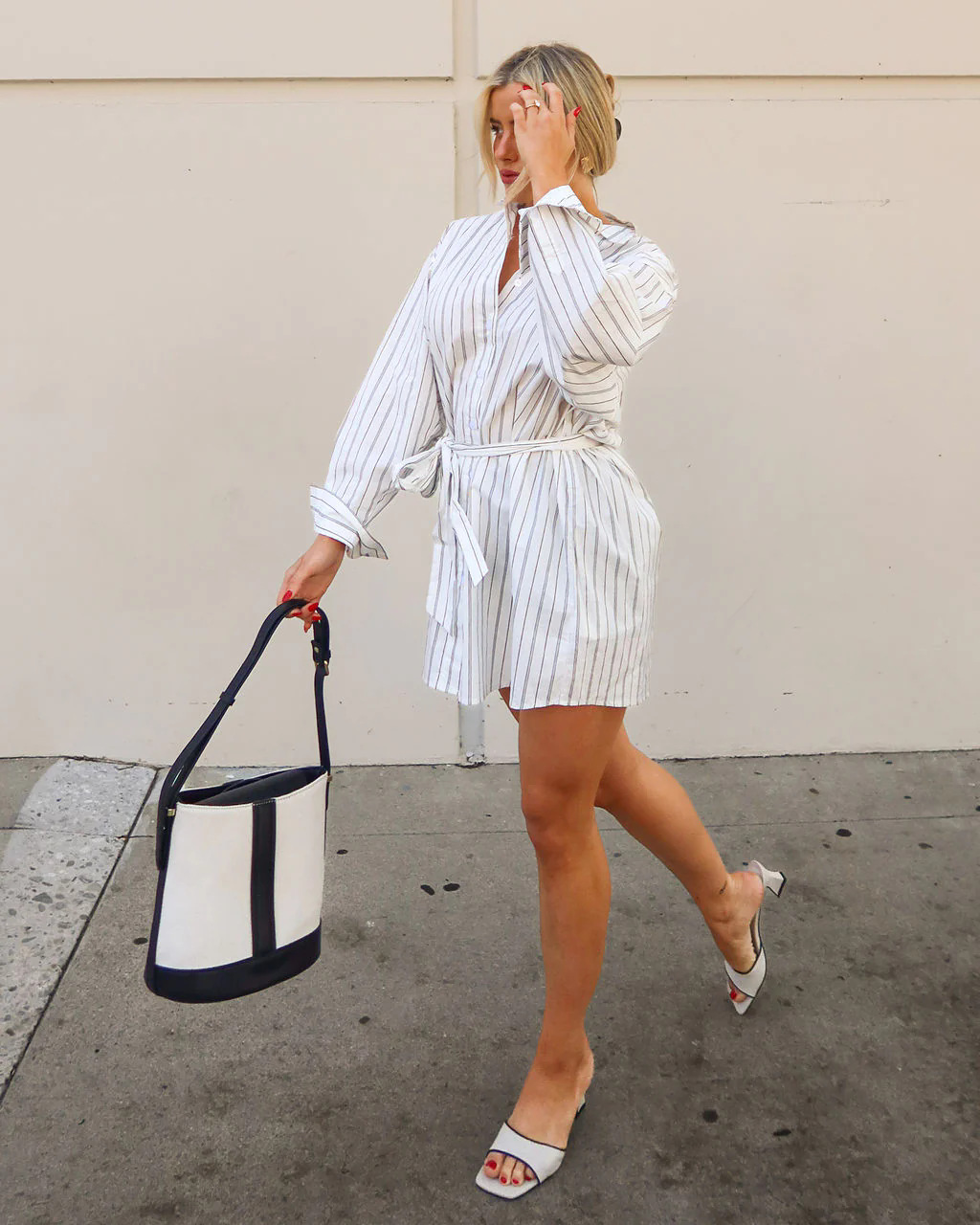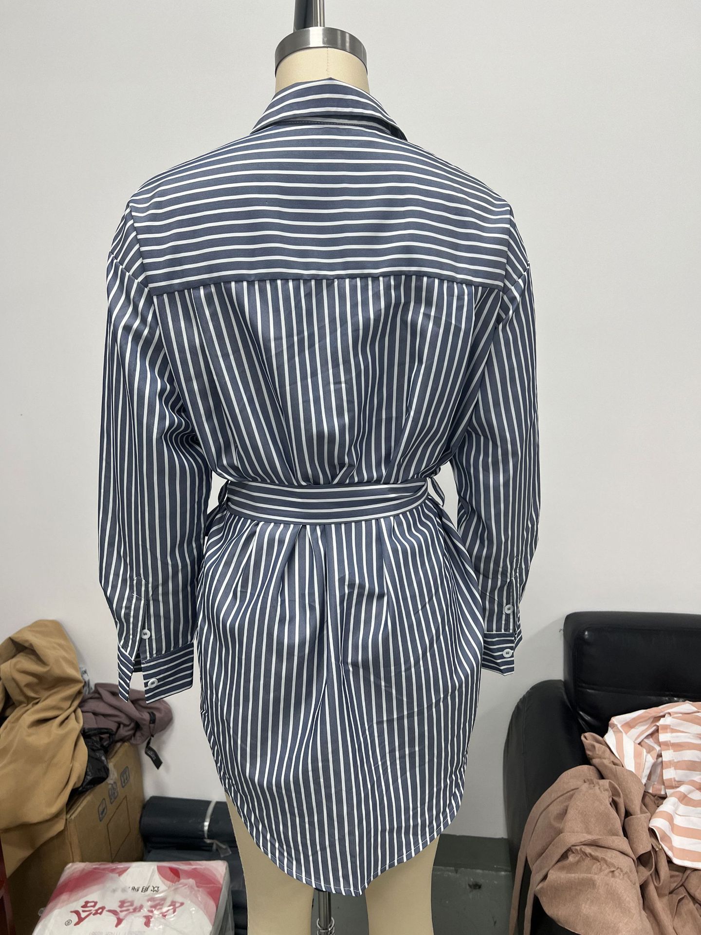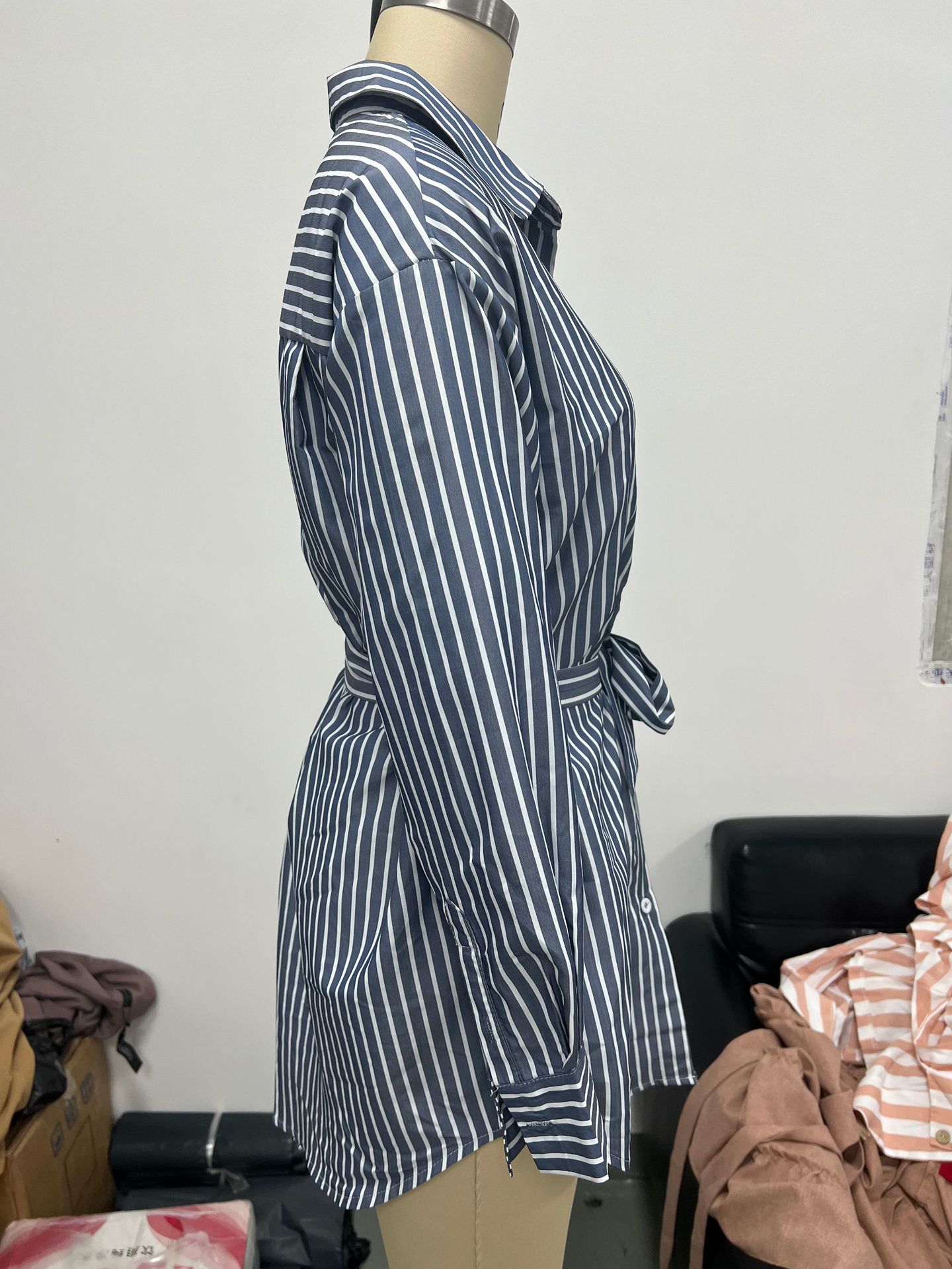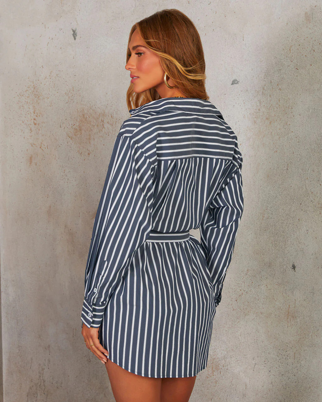 Striped Loose Tie Large V-neck Sexy Long-sleeve Shirt Short Dress